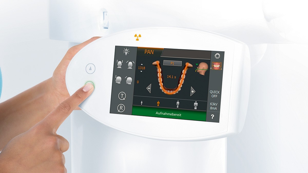 The EasyPad interface helps control the automatic positioning aids such as the patented occlusal bite block, the 3-point head fixation device and integrated temple width measurement mechanism.