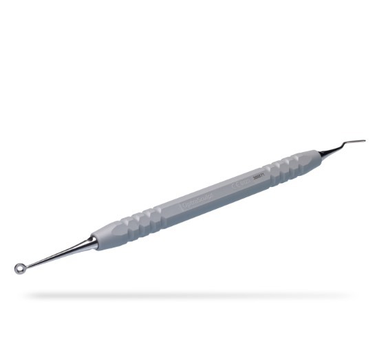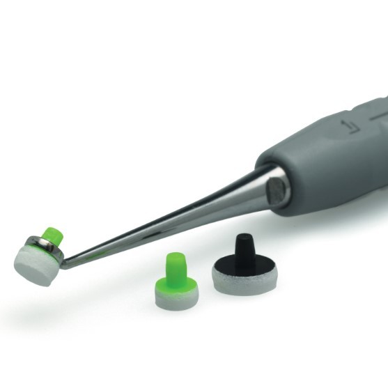 Modelling instrument with special foam pad attachments to facilitate the non-stick placement of anterior composite materials. The highly synthetic foam, which come in two sizes, optimally adjust to the tooth shape and allow fillings to be smoothly contoured.